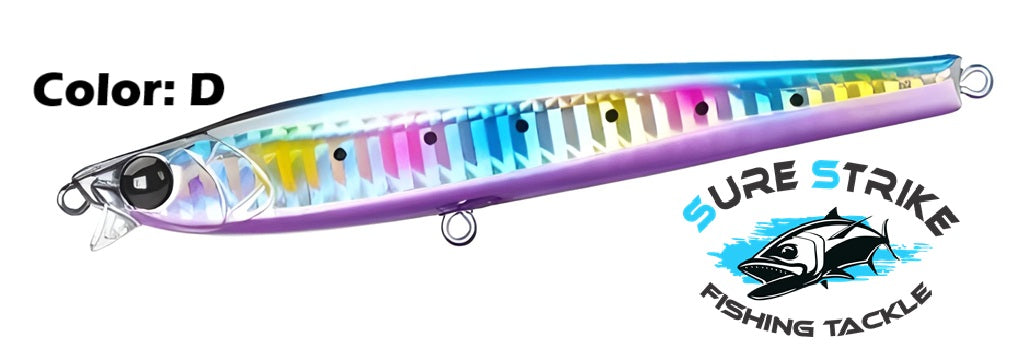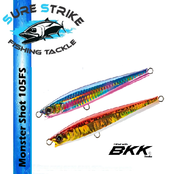 The Sure Strike Monster Shot is the most versatile hard bait on the market. It can be fished from the surface to the bottom, and everywhere in between, in a 100+ ft of water. It’s a heavy weighted lipless stick bait, that falls in a horizontal posture, with a side-to-side wobble that perfectly mirrors a dying baitfish. On a straight retrieve it has wide wobble action, when jigged or twitched it has a sharp darting action and when burned across the surface, it has a skipping action that resembles a fleeing bait. Through wire construction, a durable lead filled body and triple strength saltwater grade treble hooks, quality throughout. It comes in 17 color patterns and 3 sizes to cover everything from Spanish Mackerel and Bonita inshore, to Blackfin and Yellowfin Tuna offshore. The thin profile mirrors baits like Sand Eels, Sardines, Ballyhoo and Spearing, while giving you the weight to make long casts to spooky fish. There is nothing else like it on the market!