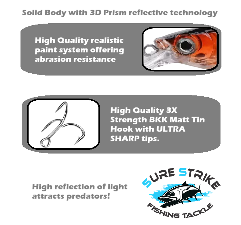 About the Hooks: The ultra sharp customized Sure Strike pinpoint sharp hooks are quick to pierce and secure a fish before they even know they are hooked!